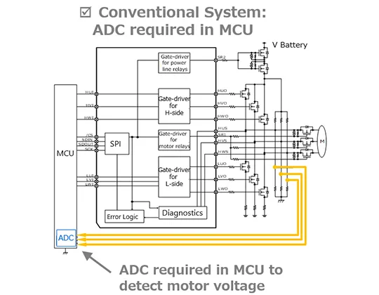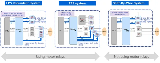 TB9083FTG有三大改进。首先,与TB9081的五个通道相比,仅包含三个用于安全继电器的通道。安全继电器可以在出现电机或外部MOSFET等异常点时实现电气切断。根据客户反馈,三个通道足以满足系统需求。对于EPS,两个通道分别用于电源继电器和反极性保护继电器,另一个通道用于电机继电器,切断电机的控制电路。(图2)