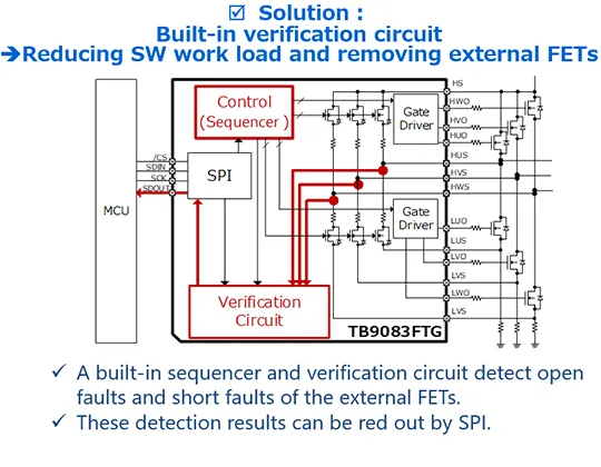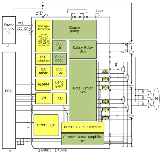 东芝电子元件及存储装置株式会社(“东芝”)推出符合ISO26262标准,支持ASIL-D安全等极[4]的车载3相直流无刷电机栅极驱动IC[3]-“TB9083FTG” [4]。该器件驱动外部 MOSFET 以旋转3相直流无刷电机(图1),并且可驱动所有3相的上下MOSFET,即六个MOSFET。器件适用的应用示例包括电动助力转向系统(简称EPS)、电动制动和线控换档系统。
